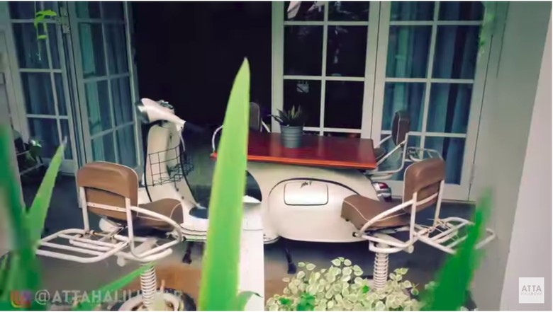 Vespa renta jadi meja di Rumah Raffi Ahmad. Foto: Screenshot Youtube/Atta HalilintarJakarta - Raffi Ahmad mempunyai sejumlah koleksi kendaraan beroda empat dan motor mewah. Rolls-Royce, Lamborghini, Mercedes-Benz, Ducati, Harley-Davidson, hingga KTM berjejer di garasi rumahnya.